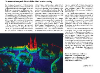 Das Titelbild zeigt drei Ansichten des Martkplatzes der oesterreichischen Stadt Horn als 3D-Punktwolke. Zu sehen ist, wie mehrere 3D-Scans, die von unterschiedlichen, nicht genau bekannten Positionen aufgenommen wurden, zu einem konsistenten Geometriemodell zusammengesetzt werden.  Die dazu notwendigen Algorithmen loesen das so genannte SLAM-Problem. SLAM (Simultaneous Localization And Mapping, Deutsch: das Problem der gleichzeitigen Lokalisation undKartierung) ist eine Technik, die autonome Roboter verwendet, um eine Karte ihrer Umgebung zu erstellen.Dies ist nicht trivial, da in diesemhochdimensionalen Schaetzsystem die Ungenauigkeiten verschiedener Sensoren integriert werdenmuessen. Die Loesung des SLAM-Problems ist eine wesentlicheVoraussetzung, dass Roboter ,,wahre Autonomie erreichen koennen.  Die aktuelle Forschung hat probabilistische Algorithmen zur Loesung des SLAM-Problems entwickelt, Ungenauigkeiten in den Messdaten werden dabei durch Wahrscheinlichkeitsverteilungen explizit modelliert. Allen SLAM-Algorithmen ist gemein, dass die verrauschten Sensordaten eines Roboter so zusammengefuegt werden, dass ein konsistentes Umgebungsmodel entsteht. Die Roboterpose (Roboterposition und Orientierung), beispielsweise durch Radumdrehungen geschaetzt, ist nur sehr ungenau bekannt, die anderen Sensordaten muessen daher diese Schaetzung korrigieren. Diese anderen Sensordaten koennen zum Beispiel Kameras, taktile Sensoren oder Entfernungsmessgeraete, wie zum Beispiel Sonar und Laserscanner, sein. Diese unterliegen aber ebenfalls Messfehlern. Da die Messfehler in der Robotik statistisch abhaengig sind, kann man nicht einfach ueber viele Messungen mitteln und hoffen, dass sich das Rauschen minimiert. Die Loesung des Problems liegt bei den so genannten geschlossenen Kreisen. Detektiert ein Roboter, dass er eine Position erreicht hat, an der er schon einmal war, kann diesesWissen dazu verwendet werden, die entstandenen Mess- und Schaetzfehler zu beschraenken.  Auf dem Titel sind Ergebnisse aus drei Teilschritten eines neuen Algorithmus zur Loesung des SLAM Problems abgebildet. Hierbei werden die Posen mit sechs Freiheitsgraden repaesentiert, so dass auch Umgebungen im Freien kartiert werden koennen.  Die oben abgebildete, anfaengliche Schaetzung der Pose wird inkrementell verbessert, bis schliesslichich der Fehler minimal wird (unten).  Der linke Teil der Abbildung stellt die Szene in einer Ansicht aus der Vogelperspektive dar. Der mittlere und rechte Teil zeigen zwei Detailansichten.  Weitere Informationen und Animationen finden sich in Dorit Borrmann, Jan Elseberg, Kai Lingemann, Andreas Nuechter und Joachim Hertzberg. Globally consistent 3D mapping with scan matching. Journal of Robotics and Autonomous Systems, 2008, bzw. auf der Webseite http://www.informatik.uniosnabrueck. de/nuechter/videos.html Eine Einfuehrung in das SLAMProblem findet sich in: Sebastian Thrun. Robotic Mapping: A Survey.  In: Exploring Artificial Intelligence in theNew Millennium. Gerhard Lakemeyer, Bernhard Nebel (Editor), Seite 1 -- 35, 2003.  Die Daten wurden freundlicherweise zur Verfuegung gestellt von RIEGL LMS GmbH (www.riegl.co.at).