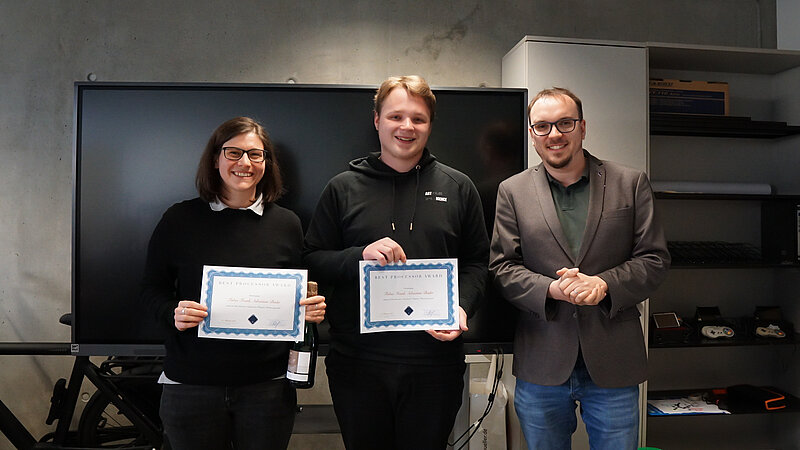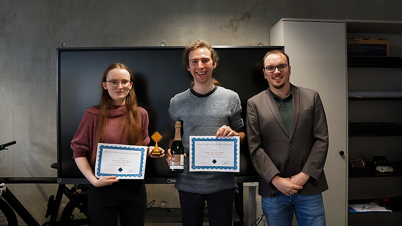 As part of the Embedded Processor Lab, the Best Processor Award is presented by Computer Engineering Group (Informatics XVII, former V). The aim of this competition is to encourage participants to independently improve or extend their design of the 32-bit RISC-V processor built during the lab in the Hardware category, and to realize a project in the Creative category that utilizes the built processor in the best possible way. As a reward for their additional effort, each winning group usually receives a certificate, a trophy, and a bottle of champagne.