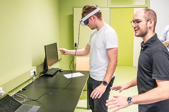 Projektteams können auch gemeinsam an einer Workstation arbeiten. Für dieses „Pair-Programming“ steht großzügig Platz in den Laboren zur Verfügung.